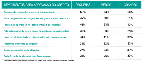 Há cerca de dois anos, o Departamento de Economia, Competitividade e Tecnologia (Decomtec) – instituição ligada à Federação das Indústrias do Estado de São Paulo (Fiesp) – realizou uma pesquisa com 1.036 empresas para avaliar o acesso ao crédito, no caso, do BNDES (Banco Nacional de Desenvolvimento Econômico e Social). Os resultados mostraram que somente 39% da amostra (403 empresas) tentaram acesso ao crédito do banco público nos dois anos anteriores, sendo que 45% desse grupo não conseguiram aprovação na ocasião, notadamente as de