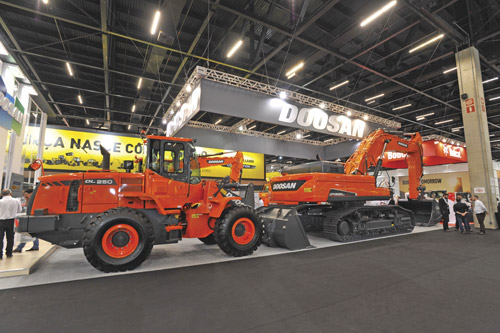 Junto a outras máquinas, a escavadeira DX530LC-5B ganhou os holofotes no estande da Doosan
