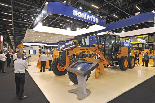 A fabricante japonesa deu destaque ao lançamento da marca neste ano no Brasil, a motoniveladora GD535-5, além de mostrar atrações como o trator de esteiras D61EX-23M0 (preparado para aterro sanitário), a pá carregadeira de rodas WA320-6 (preparada para aplicação em fertilizante), a escavadeira PC200-8M0 (em conjunto de opcionais como o cabeçote Harvester 370E e o rompedor hidráulico Montabert V1800) e a escavadeira PC350LC-8 (com caçamba HPX).