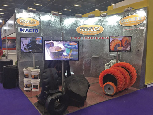Fabricante de material rodante com elastômeros de alto desempenho, a empresa expôs três produtos na M&T Expo 2018: o elastômero Tecflex, uma resina para preenchimento de pneus que substitui o ar, o selante Tecflex, uma resina que forma uma película líquida interna e veda furos de até 12 mm na banda de rodagem e no talão, e os revestimentos de rodas Softgel, indicados para plataformas tesoura, minicarregadeiras e roda dianteira de retroescavadeiras. Segundo o diretor da empresa, Ciro Nogueira, o elastômero Tecflex é uma “borracha” muito macia, que ocupa toda a cavidade de um pneu, pressurizando-o e substituindo totalmente o ar. “Ele não vaza por furos e rasgos, evitando paradas, além de dispensar calibragem e eliminar o risco de explosão”, garantiu. “O selante, por sua vez, é a solução mais barata para furos pequenos.”