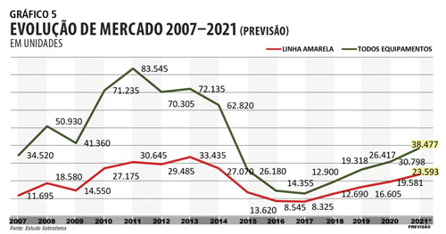 A expectativa do mercado é continuar neste ritmo de crescimento constante, atingindo um mercado de Linha Amarela de 23 mil equipamentos e um Mercado Total de 38 mil unidades. O ano de 2020 foi surpreendente, sem dúvida, com demanda acima do esperado para vários segmentos de mercado. como mineração, agricultura, estradas etc. A maioria das Construtoras e Locadoras ouvidas neste trabalho classificou 2020 como um ‘ano muito bom’, mas que poderia ter sido ‘ainda melhor’ se houvesse mais investimentos por parte dos órgãos governamentais, incluindo municípios, estados e governo federal.
