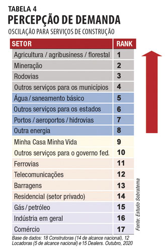 A Tabela 4 mostra a visão consolidada das Construtoras, Locadoras e Dealers sobre a oscilação da demanda nos principais mercados do Brasil para serviços de construção em 2020. Estes mercados estão divididos por setores de atividade.