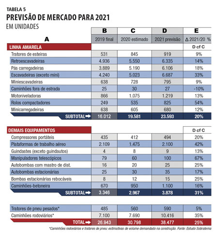 A Tabela 5 mostra as previsões do Estudo de Mercado para 2021, tanto na Linha Amarela, quanto para os Demais Equipamentos. As regras e observações técnicas feitas acima em relação à Tabela 3 aplicam-se igualmente a ela.