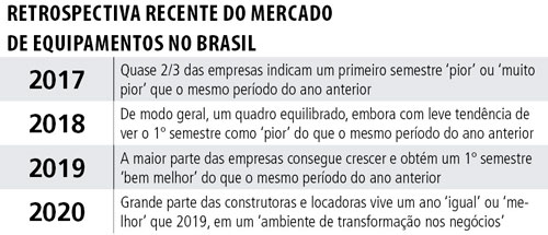 Tanto em 2019 como em 2020, o setor começou o ano otimista em relação à recuperação econômica. A ideia básica era deixar para trás a recessão que atingiu diversos setores, incluindo a construção. Mas a imprevisível chegada da pandemia, no início deste ano, gerou compreensível receio nas construtoras e locadoras, principalmente no que se refere ao possível cancelamento de obras, como também à paralisação de obras já iniciadas e mesmo a cortes dos investimentos em infraestrutura.
