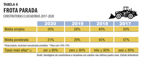 Outra expectativa dos fabricantes, é que haja uma taxa de utilização maior dos equipamentos, alavancando as vendas. A média simples de Frotas Paradas (cf. Tabela 6), excluindo-se a manutenção periódica normal, caiu de 50% em 2017 para 28% em 2019, permanecendo praticamente estável em 2020, em 30%.
