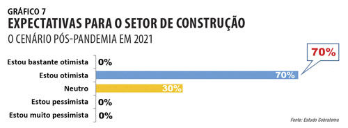 No geral, a expectativa para o setor de construção está ‘bastante positivo’ para o setor em 2021. Na sondagem de outubro, a expectativa ‘otimista’ e ‘bastante otimista’ foi de 86% para o ano de 2021. Na sondagem para 2020 (realizada em 2019 para a expectativa das empresas em 2020), esse índice foi de 76%, ou 10 pontos percentuais abaixo. Já a resposta para ‘neutro’ caiu 11 pontos percentuais em relação à sondagem para 2020, ao passo que o ‘pessimismo’ se manteve inalterado em relação à sondagem de 2020.