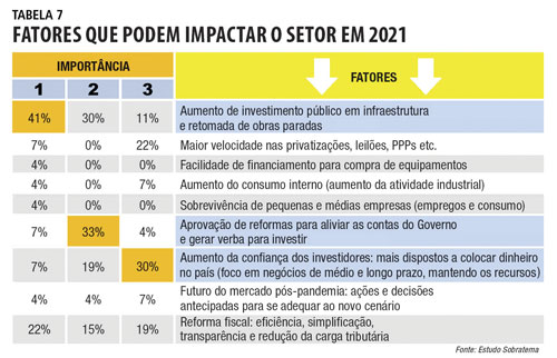 O grupo de Construtoras e Locadoras também foi convidado a escolher três fatores importantes para o êxito do setor de construção no período pós-pandemia da covid-19, já a partir de 2020. Em ordem de importância, os votos receberam pesos 1, 2 e 3 (sendo 1 o mais importante) e foram consolidados na Tabela 7.