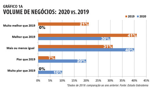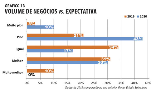 A leitura do Gráfico 1A evidencia que, mesmo dentro desse contexto desafiador, o resultado alcançado no ano foi amplamente positivo, pois 70% das empresas do segmento indicaram que o volume de negócio foi ‘igual ou melhor’ que 2019. É perceptível um movimento claro de aumento do volume de negócios no país, em contraste com o sentimento do início do ano, quando havia um receio quanto à recuperação do setor e 60% das empresas entrevistadas esperavam um ano ‘igual’ ou ‘pior’ em 2020 em relação a 2019.