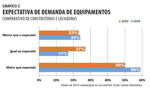 Na sondagem realizada em 2020, 27% das empresas responderam que mantiveram o ‘mesmo patamar’ de demanda esperada, enquanto em 2019 a sondagem mostrou um resultado de 17% nesse item. Da diferença de 9 pontos percentuais em ‘maior que o esperado’, a maioria migrou para ‘igual ao esperado’, demonstrando uma cautela maior das empresas de construção e locação na demanda de equipamentos.