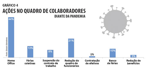 Conforme mostra o Gráfico 4, apenas 1% das empresas contratou colaboradores durante o período da pandemia, aumentando o seu efetivo. A maioria das empresas participantes da sondagem (44%) optou por trabalho remoto das equipes, enquanto aproximadamente 21% das empresas reduziram o quadro de funcionários e 21% suspenderam contratos de trabalho e deram férias coletivas.