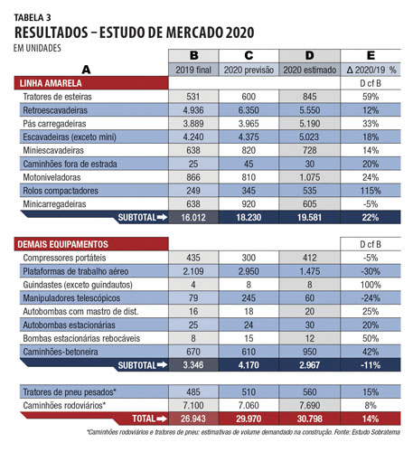 Em sua metodologia de coleta de dados, o Estudo Sobratema do Mercado Brasileiro de Equipamentos para Construção compreende três etapas anuais: ‘previsão’, ‘estimativa’ e ‘valor final’. Assim, cada família de equipamento recebe uma previsão de demanda para o ano seguinte. Em seguida, já no ano seguinte, a previsão original é substituída por uma estimativa, já mais alinhada ao mercado. Passado mais um ano, essa estimativa é substituída pela quantidade final da demanda. Sendo assim, as quantidades de 2020 foram previstas originalmente em 2019 e estimadas em 2020 para melhor alinhamento com o mercado.