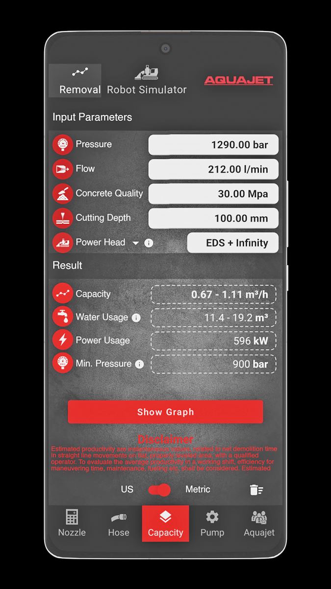 O aplicativo Calculator 3.0 inclui um conjunto de ferramentas para simplificar cálculos, otimizar o planejamento de projetos e melhorar a eficiência de robôs de hidrodemolição, permitindo calcular automaticamente valores como pressão, vazão, tamanho de bico, queda de pressão da mangueira, capacidade de remoção, configuração da bomba e outros.