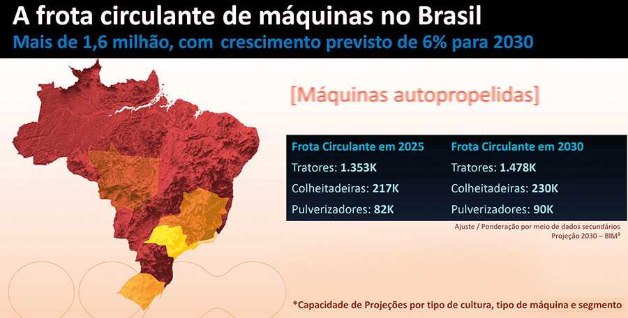 Ao cruzar as variáveis com uma metodologia própria de projeção por região, cultura, tipo de máquina e segmento, a [BIM]³ estima que, até 2030, a frota agrícola brasileira deve chegar a cerca de 1,8 milhão de unidades – com 1,48 milhão de tratores, 231 mil colheitadeiras e 89 mil pulverizadores.