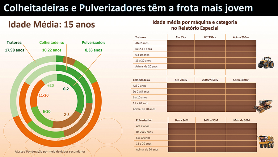 Por sua vez, a média de idade do parque instalado é de 15 anos, chegando a 18 anos em tratores, 10 anos em colheitadeiras e 8 anos em pulverizadores, sendo que mais de 50% da frota já supera os 15 anos de uso.