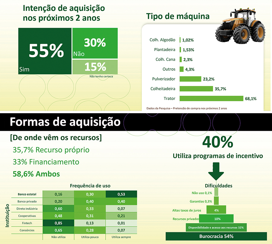 Mesmo diante do aumento do interesse pela locação, a pesquisa mostra que 55% dos agricultores entrevistados pretendem adquirir máquinas novas nos próximos dois anos, enquanto 30% não têm planos nesse sentido e 15% ainda não decidiram.