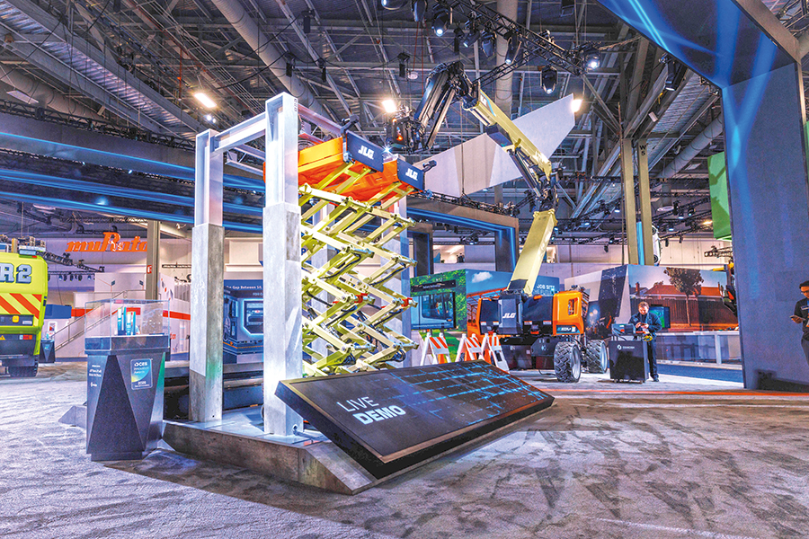 A companhia preparou uma exposição centrada em equipamentos conectados e robótica. Nessa linha, foi realizada uma demonstração ao vivo (“Live Demo”, na imagem) com diversas máquinas operando de forma coordenada, incluindo duas plataformas do tipo tesoura para transportar e posicionar materiais estruturais, enquanto uma plataforma de lança, equipada com equipamento de soldagem, realizou tarefas de precisão em alturas elevadas.