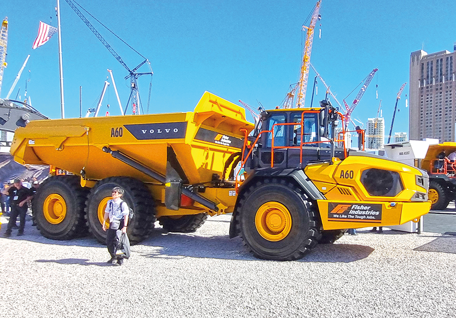 A Volvo CE exibiu cerca de 20 máquinas, com 14 lançamentos e modelos inéditos. O destaque foi o caminhão A60 (foto), maior fora de estrada articulado da marca que promete 15% de melhoria na eficiência de combustível e aumento de 5% em produtividade. Com capacidade de carga de 55.000 kg e novo trem de força, o modelo ADT 6x6 tem peso bruto de 98.750 kg e motor de 470 kW, podendo atingir 57 km/h.