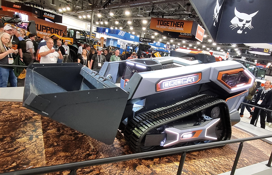 A marca divulgou diversas tecnologias de IA, eletrificação e autonomia. Na linha de carregadeiras compactas, o destaque foi o modelo conceitual RogueX3 (foto), uma máquina elétrica autônoma com configurações modulares de cabine, disponível com rodas ou esteiras. A fabricante também apresentou a minicarregadeira MT120, agora com o sistema telemático Machine IQ para proteção contra roubo.