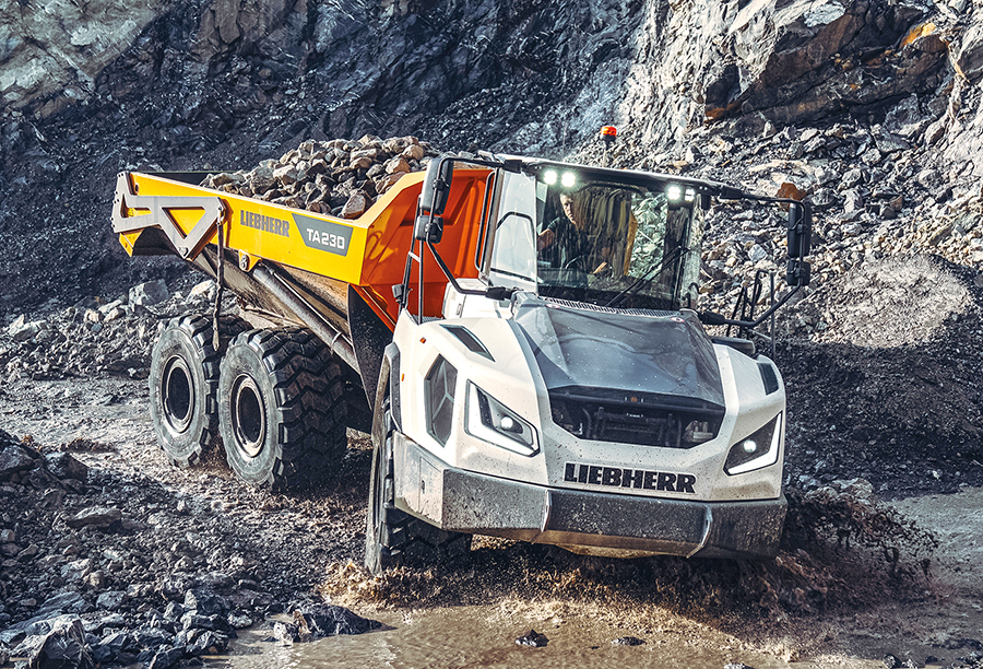 Exibido pela Liebherr, o caminhão articulado TA 230 Litronic ganhou demonstrações ao vivo.LIEBHERR.