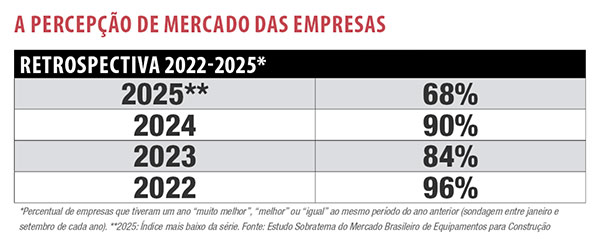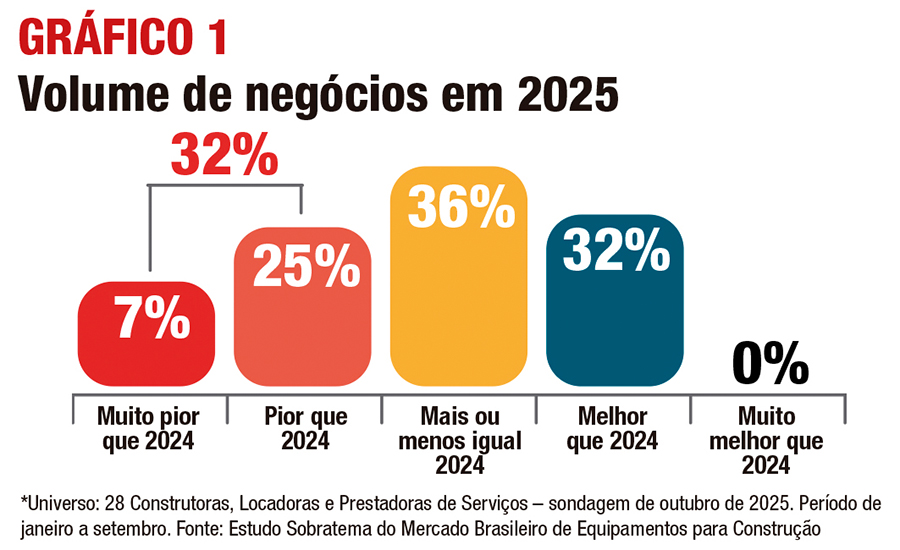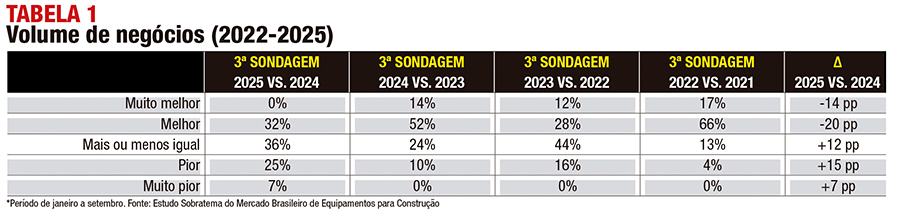 Na visão de 28 empresas do setor consultadas nesta edição do estudo (incluindo empresas de Construção, Locação e Prestadoras de Serviços), o volume de negócios indica estabilidade no período de janeiro a setembro de 2025, se comparado ao mesmo período de 2024.