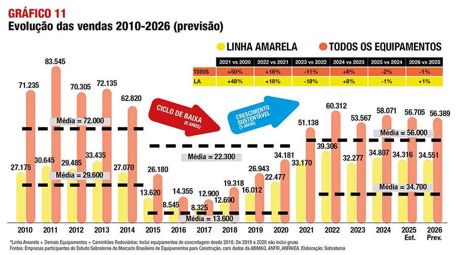 Em uma análise retrospectiva dos últimos anos, é possível constatar que o mercado brasileiro de máquinas para construção entrou em um ciclo estável e linear de vendas no período 2024-2026, com cerca de 34 mil equipamentos embarcados e viés de crescimento.