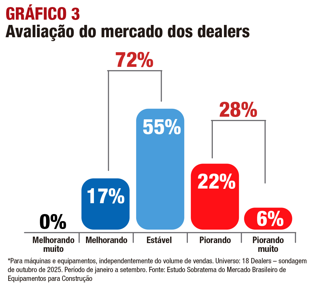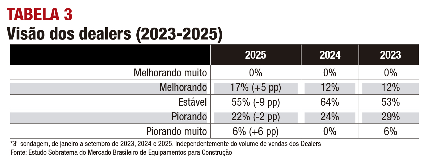 Já 28% dos Dealers disseram que o mercado estava “piorando” e “piorando muito” no período de janeiro a setembro de 2025, contra 24% com a mesma percepção no 3º trimestre de 2024.