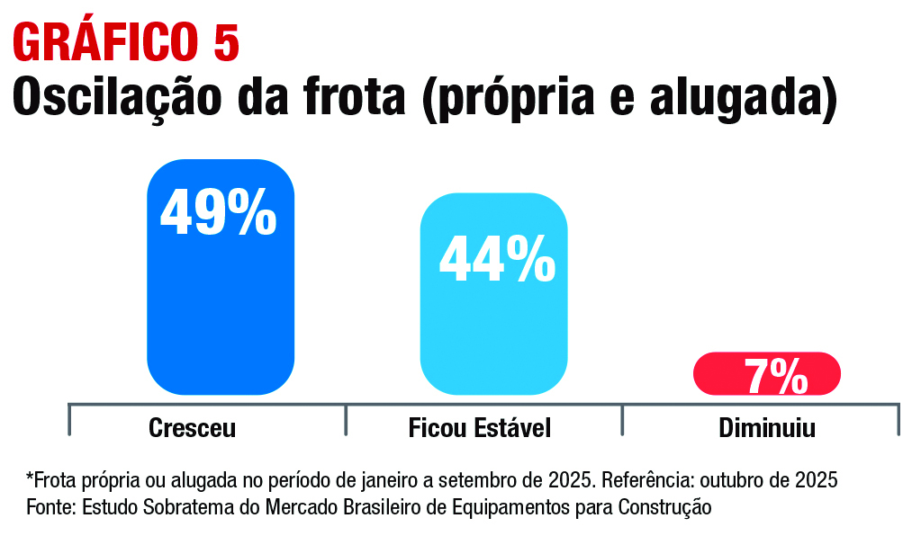 O Gráfico 5 mostra como a frota se comportou desde o início do ano. Dada a relevância do mercado de locação no Brasil, a sondagem foi focada em empresas de construção, que foram questionadas se a frota (própria ou alugada) cresceu ou diminuiu no período de janeiro a setembro em 2025.
