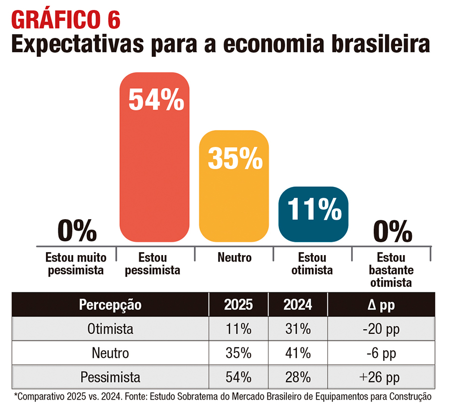 Em relação à sondagem de 2024, no período de janeiro a setembro de 2025 houve uma redução de 20 pp para as respostas “bastante otimista” e “otimista”, mostrando que o grupo está “mais preocupado”, com a economia brasileira em 2025, uma vez que o ano passado foi considerado bom para os negócios, sempre de acordo com os participantes.