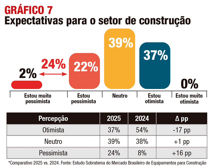 Na sondagem de outubro de 2025, a expectativa “otimista” e “bastante otimista” para o setor de construção é de 37%, em uma redução de 17 pp em relação à sondagem de 2024.