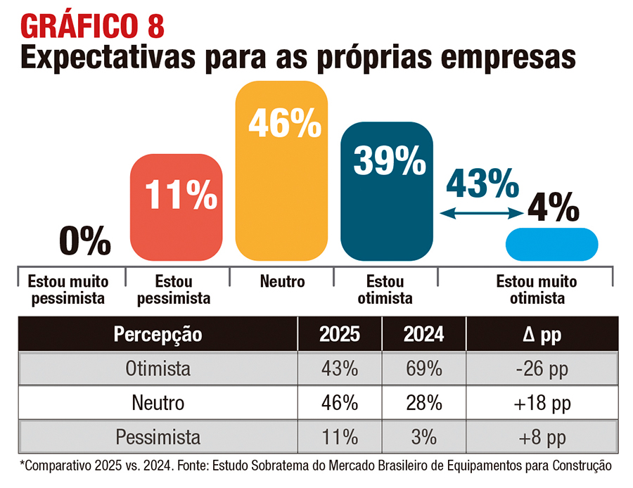 O índice “neutro” foi de 46%, em um acréscimo de 18 pp em relação à sondagem de 2024 no mesmo período. Completando as expectativas, o índice “pessimista” foi de 11%, acima dos 3% registrados na sondagem de 2024, em um acréscimo de 8 pp.