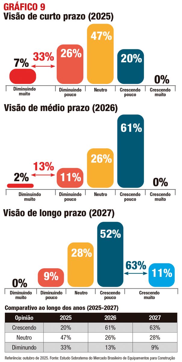 No cenário de médio prazo, 61% das empresas declararam que o mercado pode crescer (“muito” e “pouco” agregados), mostrando um otimismo maior para 2026.
