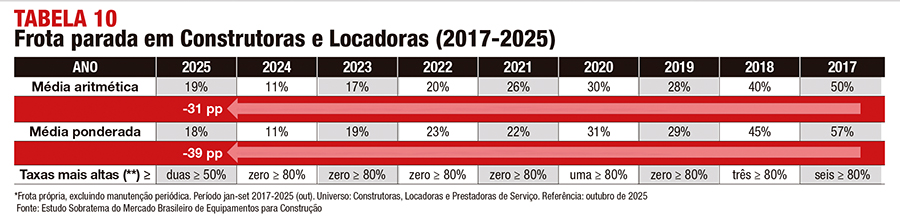 No último quinquênio, a média aritmética das frotas paradas – excluindo-se a manutenção periódica normal – vinha caindo progressivamente, de 50% (2017) para 11% (2024), voltando a subir para 19% em 2025.