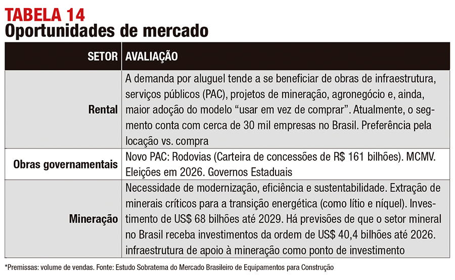 Após um ano de expectativas ajustadas, com “estoque acima do esperado” e “sem superdimensionar investimentos”, o próximo ano pode oferecer um posicionamento mais positivo em termos de vendas para as empresas, com renovação de frotas, investimentos governamentais e oportunidades em serviços e periféricos (concessões e PPPs), mirando atividades que puxam o setor de bens de capital – como infraestrutura, construção pesada, mineração e agribusiness.
