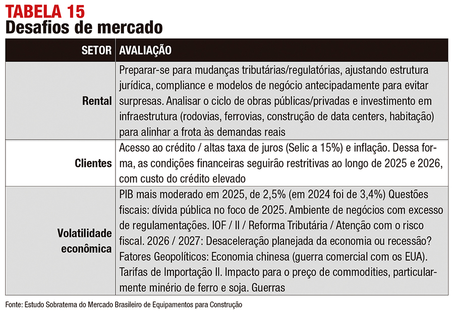 Para descobrir os motivos disso, o estudo sondou os “principais desafios” que afetaram o negócio e a receita em 2025, conforme avaliados pelas próprias empresas (em um universo de 38 empresas, incluindo Dealers, Locadoras, Construtoras e Prestadoras de Serviços).