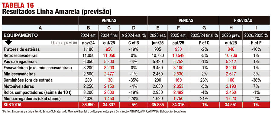 Em 2025, a estimativa é de leve queda nas vendas, com uma redução de 1% (de acordo com o quadro) para a Linha Amarela em comparação ao ano passado.