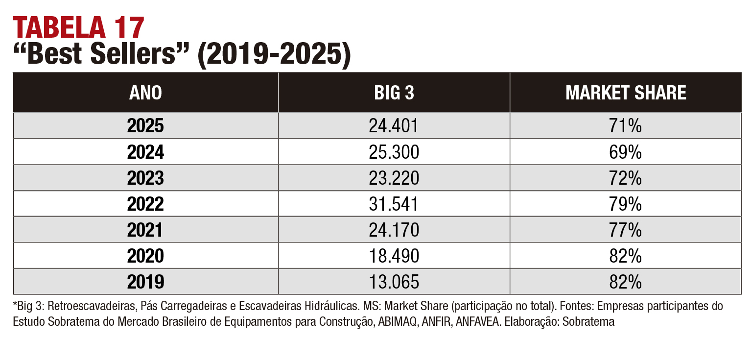 Composto pelos equipamentos com o maior volume de vendas no país, o grupo “Big 3 – Best Sellers” inclui Retroescavadeiras, Pás Carregadeiras e Escavadeiras Hidráulicas.