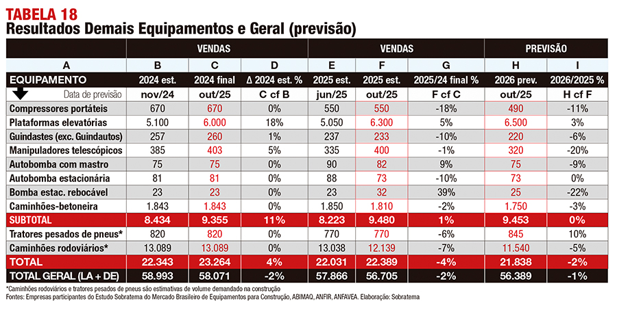 Na Tabela 18, a diferença entre a previsão “Total Geral” do mercado de equipamentos em 2025 (Colunas E), feita em junho de 2025, e a estimativa atual (Coluna F), feita em outubro de 2025, é de 2% de redução, repetindo o resultado de 2024, considerando-se a estimativa de junho de 2025.
