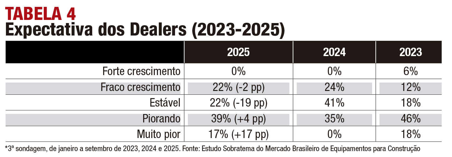 Conforme indicado nos resultados da sondagem, a expectativa dos Dealers para o mercado em 2025 é de redução no faturamento.