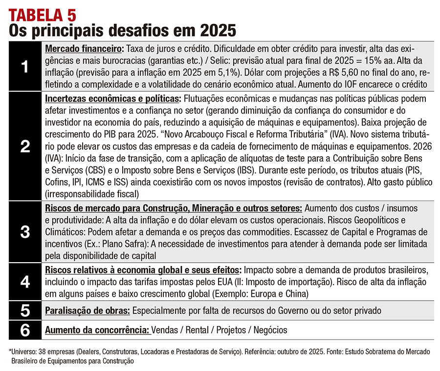 Em 2025, a indústria de máquinas e equipamentos de fato enfrentou vários fatores inibidores da demanda, sendo que os mais votados pelos Dealers estão listados na Tabela 5.