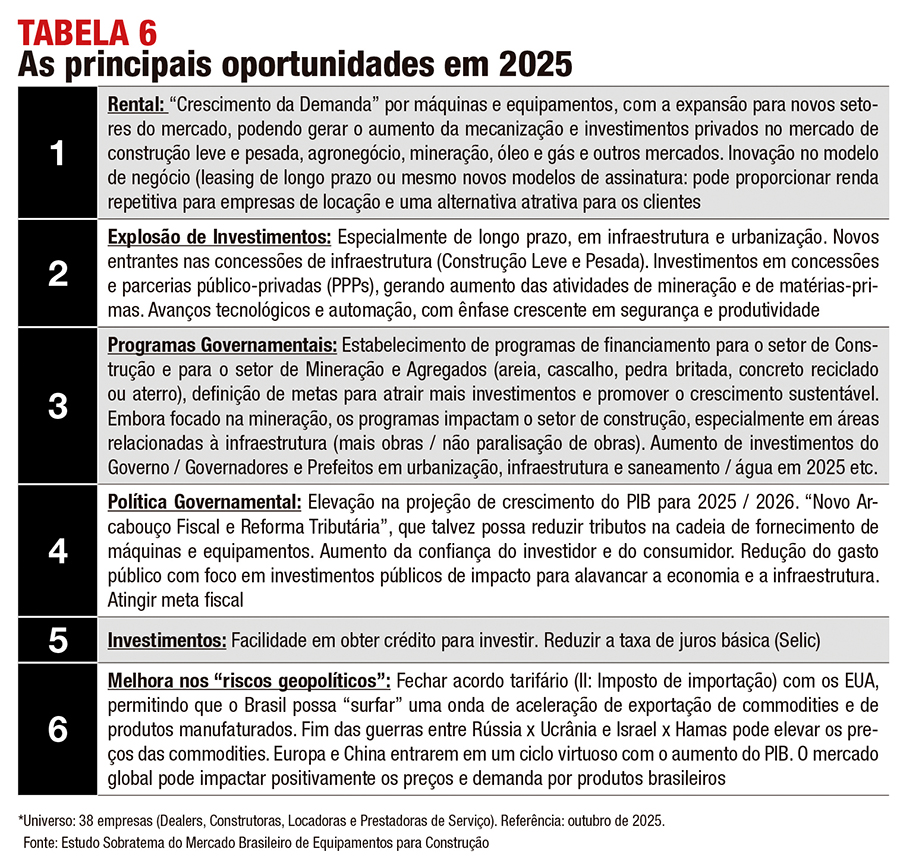 Em contraste, as “principais oportunidades” indicam os fatores que podem gerar negócios e receitas para as empresas em 2025, entre 38 Dealers, Locadoras, Construtoras e Prestadoras de Serviços ouvidas na sondagem.
