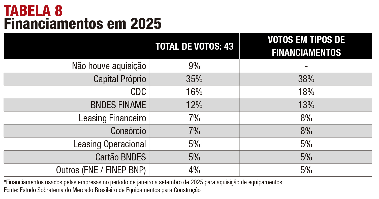No que se refere às estratégias, as Construtoras, Locadoras e Prestadoras de Serviços também revelaram como os investimentos foram posicionados em 2025, especialmente em relação aos modelos de financiamentos utilizados (v. Tabela 7).