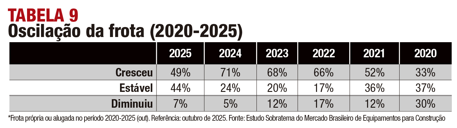 Na mesma questão, 44% das empresas responderam que a frota alugada e própria permaneceu “estável” em 2025, enquanto em 2024 foram 24% das respostas, em um acréscimo de 20 pp no período de um ano.
