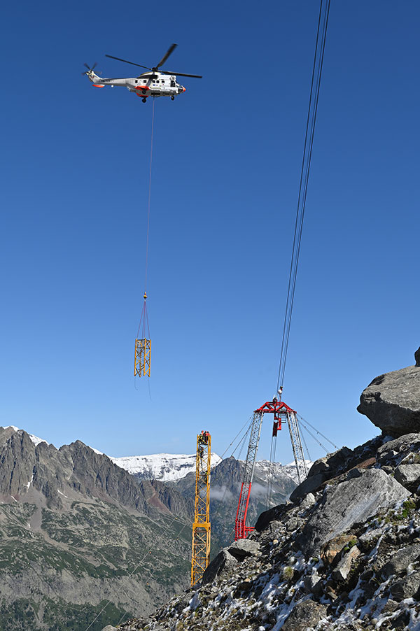 O terreno extremo e o difícil acesso ao local da construção exigiram um helicóptero para instalar os equipamentos, alugados pela Mellet Billion Travaux en Montagne (MBTM) do distribuidor Potain Valente Grue Assistance.