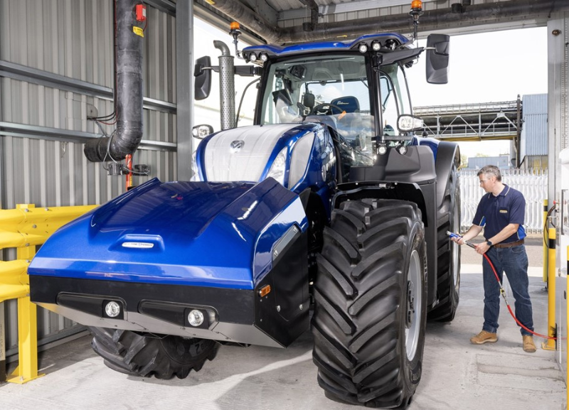 O trator T7 Methane Power pode operar com biometano obtido a partir de dejetos de animais, promovendo a sustentabilidade nas próprias fazendas.