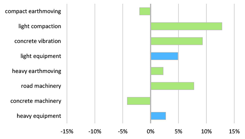 Vendas de equipamentos de construção por grupo de produtos na Europa em relação ao ano anterior. Fonte: CECE Annual Economic Report