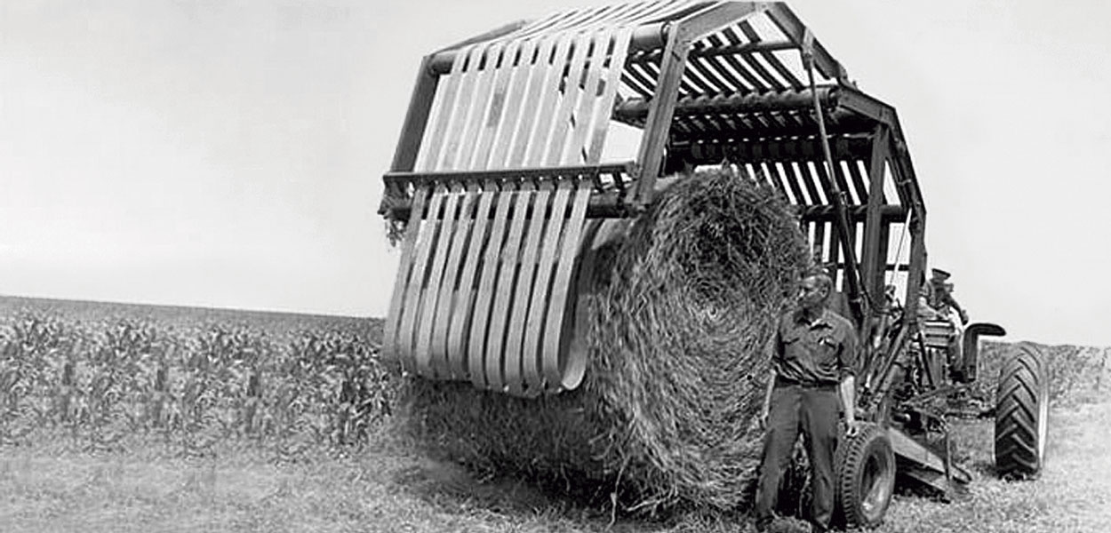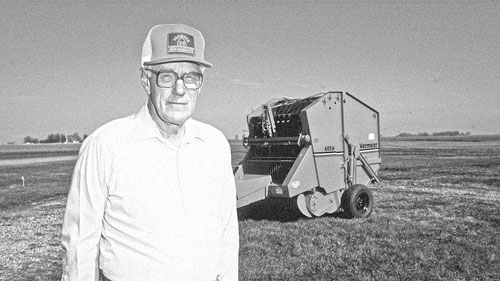 O pioneiro Gary Vermeer (1918-2009), tendo ao fundo a histórica enfardadeira 605H, lançada em 1971