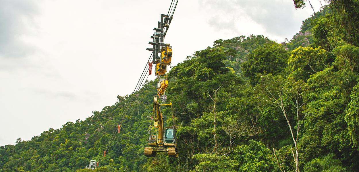 Originalmente, o Cable Crane foi concebido para iniciar o emboque e as escavações do Túnel 3, além de dar apoio à construção do Viaduto V3, que terá 310 m de extensão. O engenheiro Euzair Rodrigues Siqueira Jr., gerente de equipamentos da obra, conta que havia dificuldade de acesso ao local, imposta pelas condições naturais e geotécnicas do terreno no trecho de serra, o que exigiu uma solução específica – e inédita. “Não havia outro método”, diz o gerente. “Sem esse equipamento, seria necessário abrir um caminho de serviço complexo, suprimindo uma área de 41 mil m2 de mata nativa.”