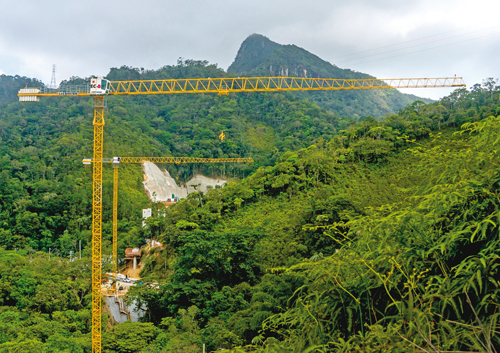 Integrantes do grupo de seis guindastes mobilizados pela obra na Tamoios, duas unidades do modelo de torre 85 EC-B 5b atuaram exclusivamente na construção dos viadutos V5, V4 e V3, auxiliando na movimentação de aço, fôrmas, peças pré-montadas de concreto e outros materiais utilizados nos canteiros.