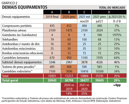 Na categoria Demais Equipamentos (Gráfico 2), a comparação com 2020 revela um aumento de 29%, ou quatro pontos percentuais acima do previsto. Em Caminhões Rodoviários, um dos destaques da categoria, a Federação Nacional da Distribuição de Veículos Automotores (Fenabrave) projeta um crescimento de 31% na demanda para este ano, comparado com o ano passado.
