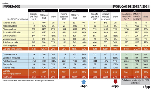 Quanto aos importados (Gráfico 3), o mercado da Linha Amarela registrou 25% de participação, exatamente um quarto. “Houve um crescimento de participação de equipamentos importados em seis pontos percentuais, mas em 2020 o mercado havia retraído em oito pontos percentuais nesse índice”, pondera o executivo da Sobratema.